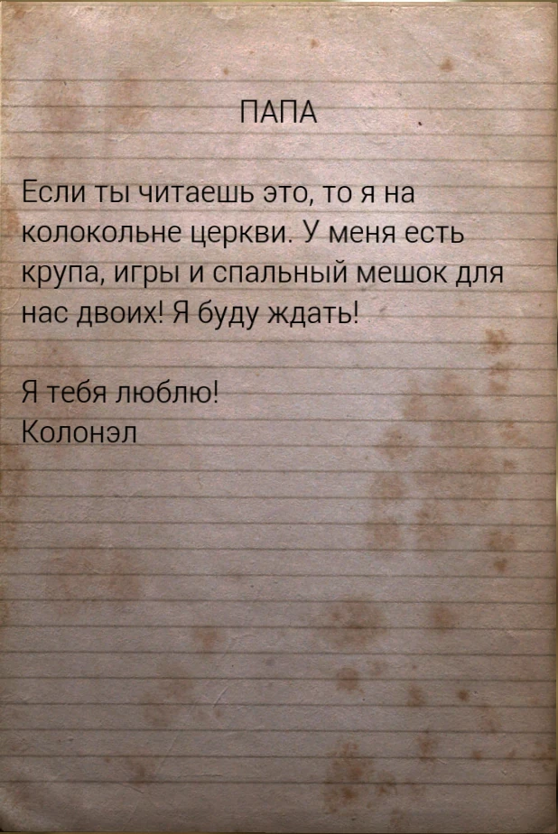 Если ты читаешь это, то я на колокольне церкви. У меня есть крупа, игры и спальный мешок для нас двоих! Я буду ждать!