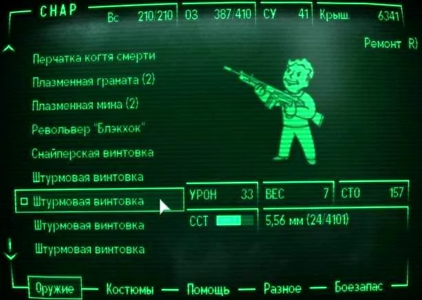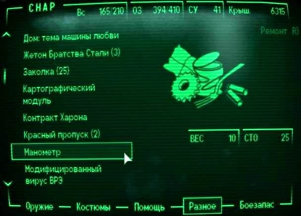 - СТО — стоимость предмета в крышках. Здесь указана базовая стоимость, зависящая только от состояния предмета (если он может изнашиваться). В общем случае покупки будут совершаться по цене, большей СТО, а продажа — по цене ниже СТО. Цена покупки-продажи зависит от уровня навыка «Бартер». С навыком «Бартер» 100 персонаж игрока будет продавать и покупать вещи по их стоимости.
