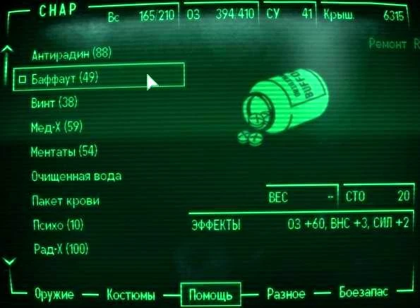 В меню «Помощь» показано всё, что персонаж может использовать для изменения собственных параметров: стимуляторы, химикаты, любые книги и журналы.