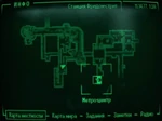 - Здесь показана карта всей Столичной Пустоши или карта Мохаве. На карте отмечены маркерами все локации, исследованные персонажем за время путешествия. Можно быстро переместиться в любое из исследованных ранее мест, выбрав его маркер и щёлкнув левой кнопкой по нему на карте.