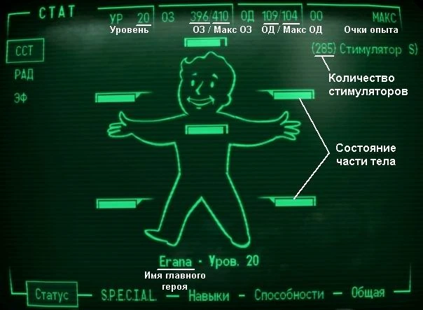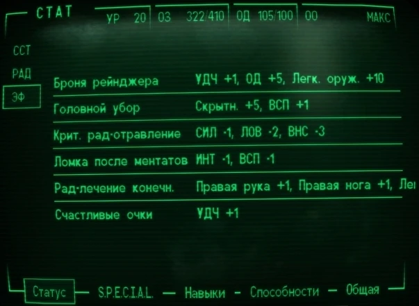 В меню «Стат» (статистика) пять разделов: «Статус», «SPECIAL», «Навыки», «Способности», «Общее».