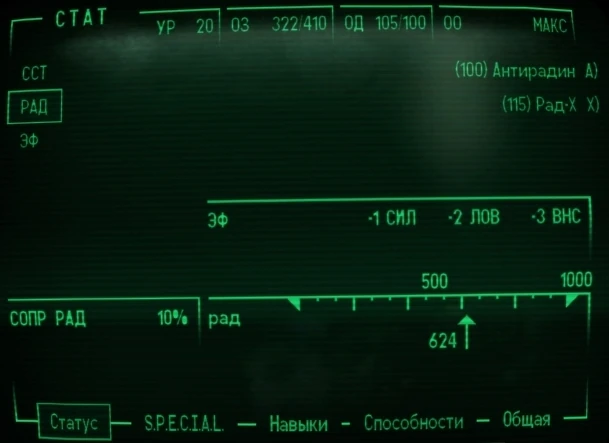 - Показывает текущий уровень сопротивляемости радиации и полученную дозу радиации в рад. Если в снаряжении есть антирадин, нужно нажать клавишу «A», чтобы вывести радиацию из организма. Если есть Рад-X, можно нажать клавишу «X», чтобы на время увеличить сопротивление персонажа к радиации.