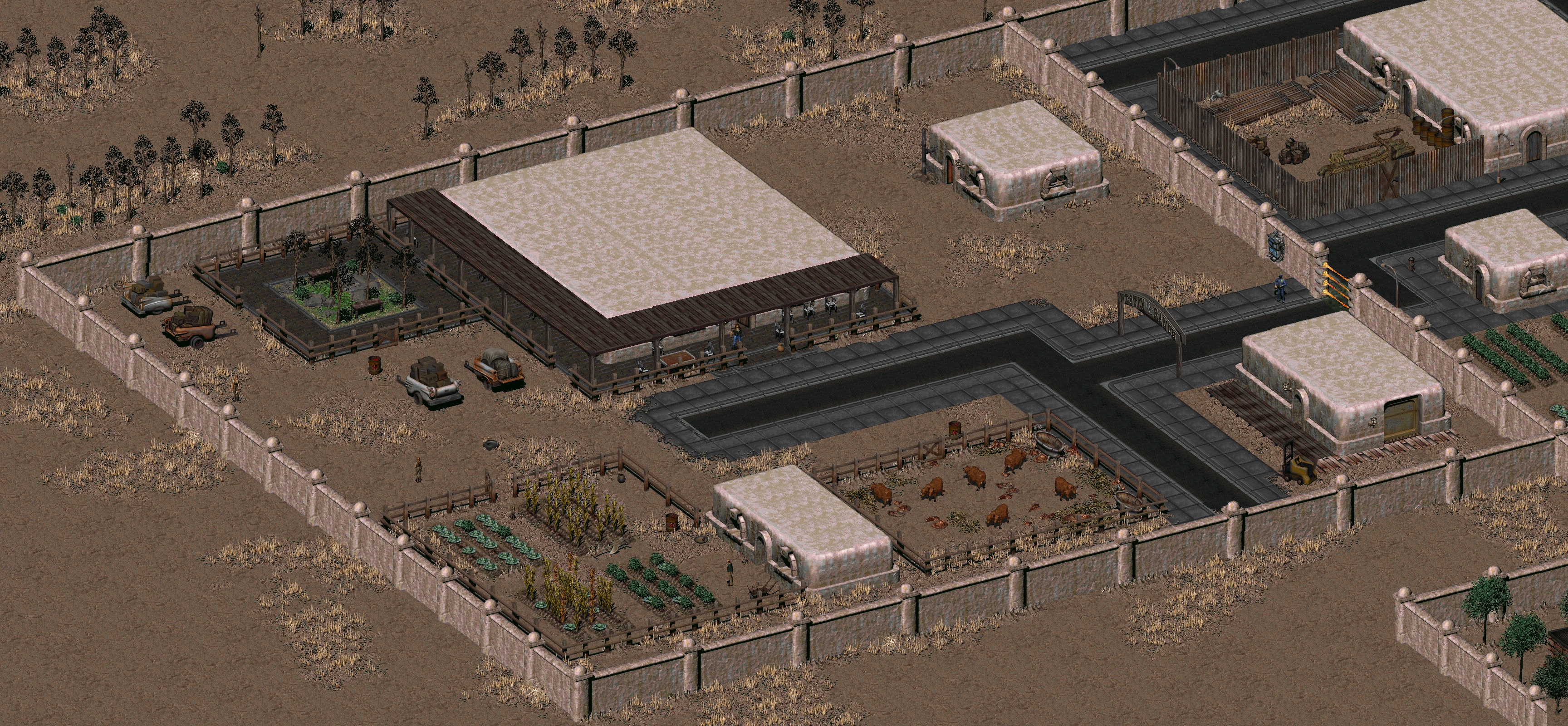 На территории ранчо так же находятся три маленьких рабочих здания, предназначенных для обслуживания различных видов хозяйств и хранения соответствующих вещей там. Одна постройка находится в северо-восточной части ранчо и имеет механизм, аналогичный по конструкции (и фактически, состоянию) очистителю, найденного Выходцем из Убежища в Некрополе. В связи этим можно сделать предположение, что это устройство выполняет такую же функцию, то есть является очистителем. Еще одно здание, располагается к юго-востоку и несёт функцию хлева, в котором живут брамины, на которых, кстати, Вестин «сколотил» состояние. Последнее здание стоит в дальнем юго-западном углу, рядом с огородом. Судя по всему, тут хранятся сельскохозяйственные предметы и орудия труда. Возможно, единственная кровать в помещении принадлежит смотрителю ранчо и правой руке Вестина — Феликсу.