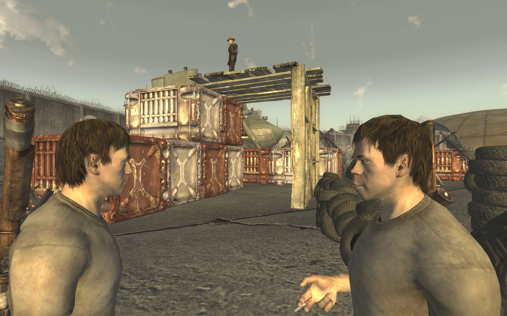 Курьер мог встретить двух рекрутов НКР в лагере Маккарран. Они бегают по полосе препятствий и отжимаются, подгоняемые криками сержанта-инструктора.