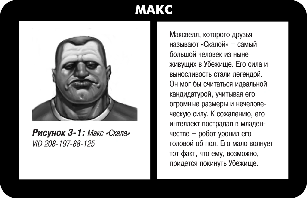 Персонажи — это население игрового мира. Ваш персонаж — это ваше «второе я». Мы будем также называть его «героем». Прочих персонажей принято называть NPC (от английского non-player characters). NPC — это другие обитатели Убежища, люди из внешнего мира и даже мутанты.