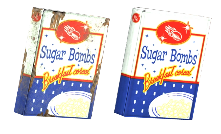 Представляет собой воздушные хлопья, по форме напоминающие маленькие ядерные снаряды, в сине-белой картонной упаковке. Пачка сладких кукурузных хлопьев, содержит 100 % ежедневной нормы сахара. На просторах Пустоши встречается в двух видах: с радиацией и без неё. Пачка «Сахарных бомб» без радиации — это редкая довоенная версия с более чистым внешним видом, в которой отсутствует радиация, хотя её нельзя использовать в рецептах, требующих сахарных бомб.