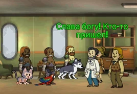 Внутреннее устройство локации случайно. При перемещении по локации жителям могут встретиться случайные противники. Для выполнения задания жителям необходимо поговорить с двумя группами учёных и убить светящегося радтаракана.