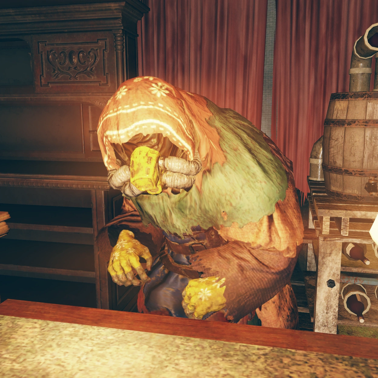 - ↑ PTS Update Notes - 10/10: Meet Windy, Milepost Zero’s resident Cryptid Hunter and Merchant. Collector Murmrgh: After you have hired and upgraded all the base employees at Milepost Zero, Collector Murmrgh will become available for hire. With no additional upgrades needed, Collector Murmrgh will offer Mystery Boxes in exchange for supplies. These mystery boxes will contain rewards that range from RadX, Stimpaks, Legendary Weapons/Armor to Legendary Scrip, Treasury Notes and even outfits!