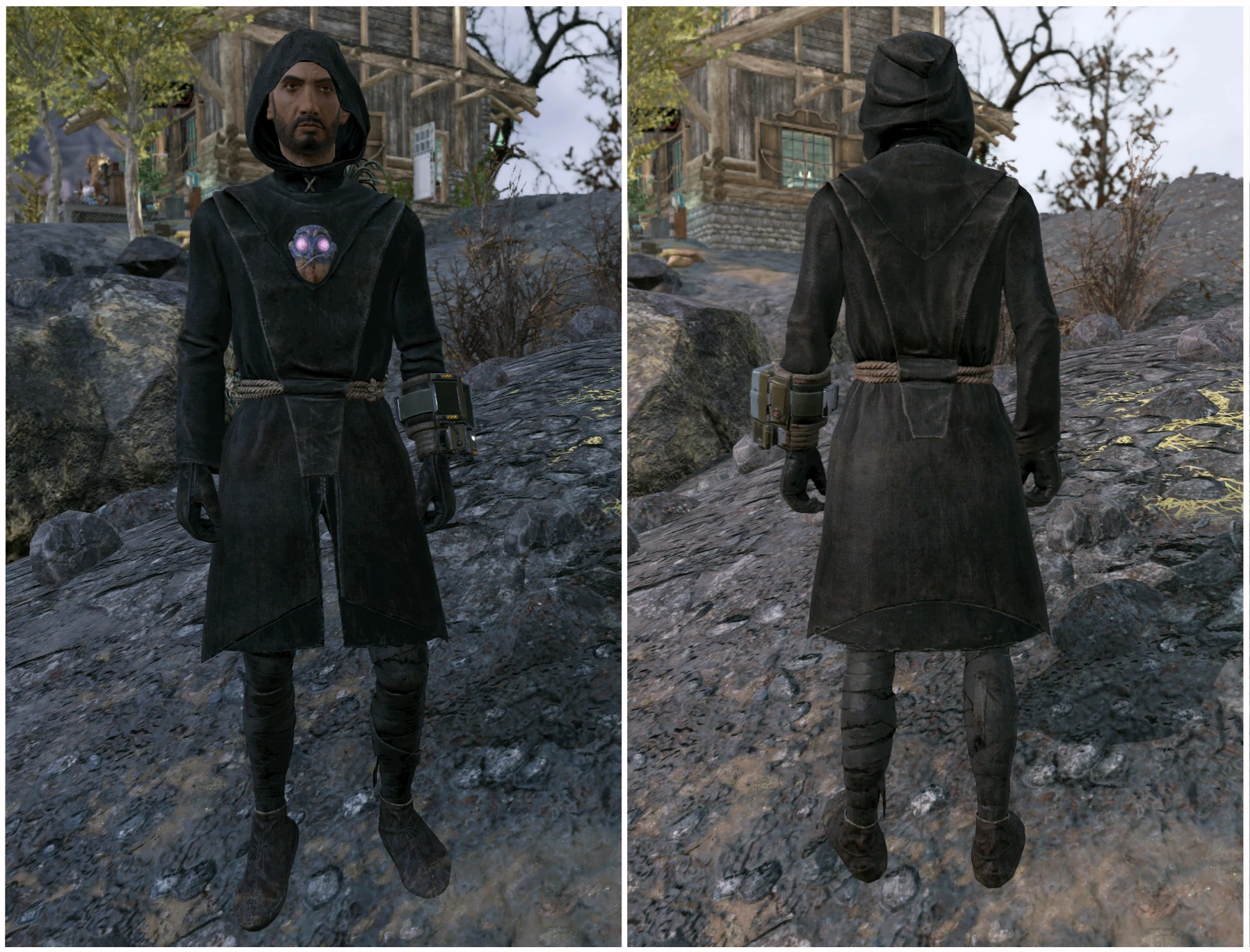 Наряд состоит из чёрной туники, коричневой повязки типа леггинсов и коричневых перчаток. Мантия дополняется соответствующим капюшоном.