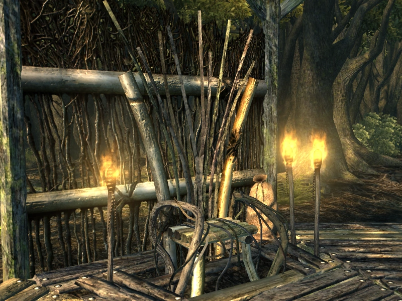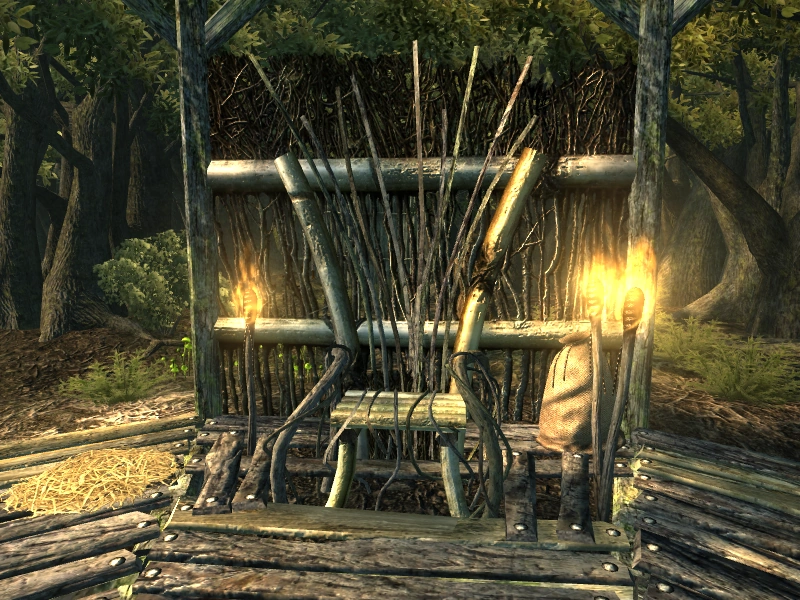 Каркас трона с высокой веерообразной спинкой сделан древенами из тонких изогнутых жердей, сиденье собрано из четырёх чурок, переплетённых высохшей лозой. По обеим сторонам от гнутых подлокотников установлены горящие факелы (один слева и два справа), справа от трона Одинокий Путник может обнаружить холщовый мешок.