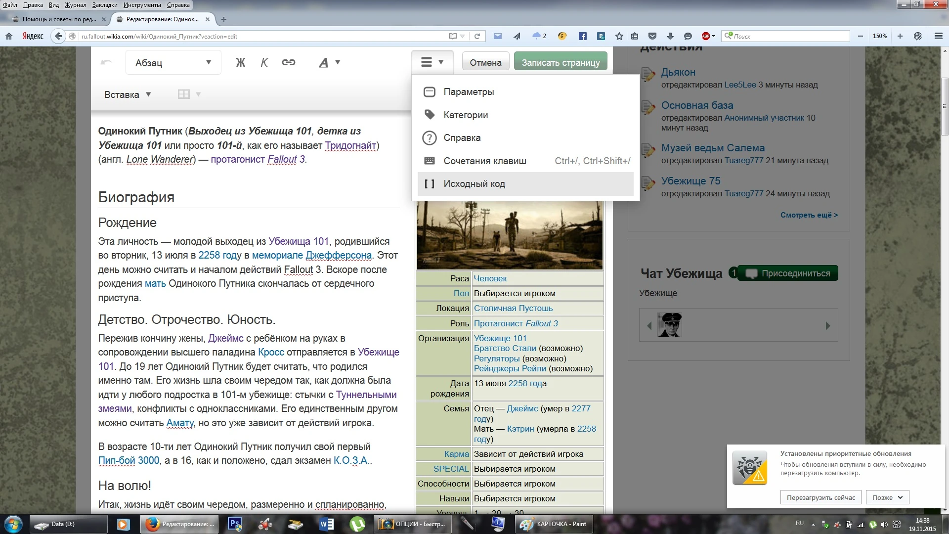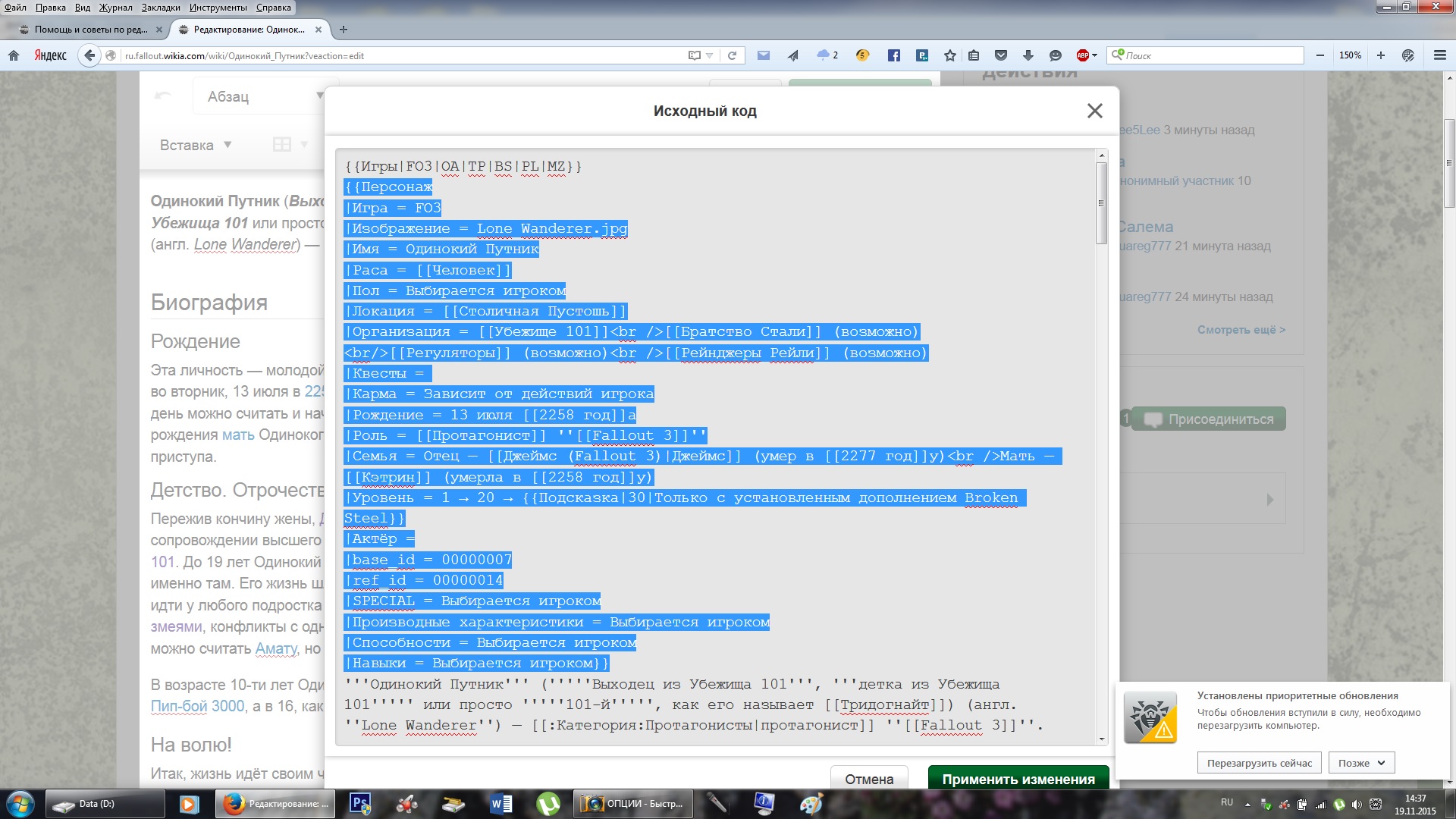 Открываете в «исходном коде» редактор аналогичной статьи(например, про персонажа), копируете часть содержимого(или всё), открываете в другой вкладке создание или правку статьи, которую требуется написать, вставляете. Затем в режиме «предпросмотра» наблюдаете, что получилось, соотносите с кодом увиденное, оставляете заголовки и т. п., а содержание(например после = в карточке) меняете на нужное и снова предпросмотр, чтобы не сделать неправильно. В случае с Fallout 4 можно использовать, как образец, статьи про персонажей Fallout 3