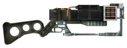 Фокусировочная оптика для трёхлучевой лазерной винтовки появляется только в дополнении к Fallout: New Vegas — Gun Runners’ Arsenal .