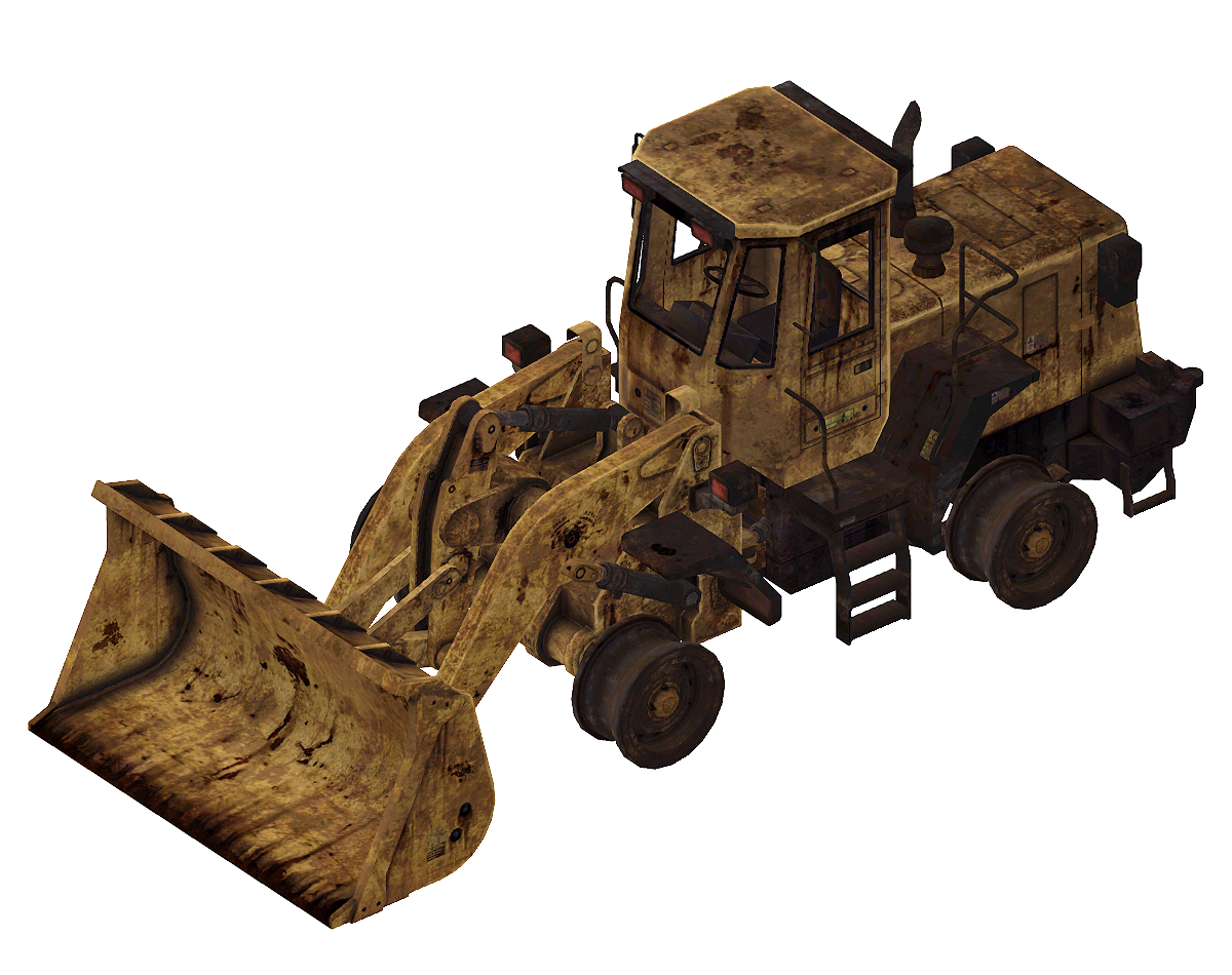 Крепкий, тяжёлый строительный транспорт, сконструированный для того, чтобы выкапывать траншеи, ямы под фундамент, перевозить рассыпчатый груз и для других всевозможных целей. Цвет когда-то был ярко жёлтым, но от воздействия с окружающей средой и ржавчины стал бледно-коричневатым. Шины с колёс были сняты на неизвестные нужды.