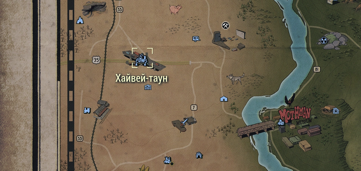 - В Хайвей-тауне изначально был стандартный значок маркера карты «Шоссе», пока в патче 0.1.1911.0 для Fallout 76 Public Test Server он не был заменён новым, уникальным значком, характерным для этой локации.