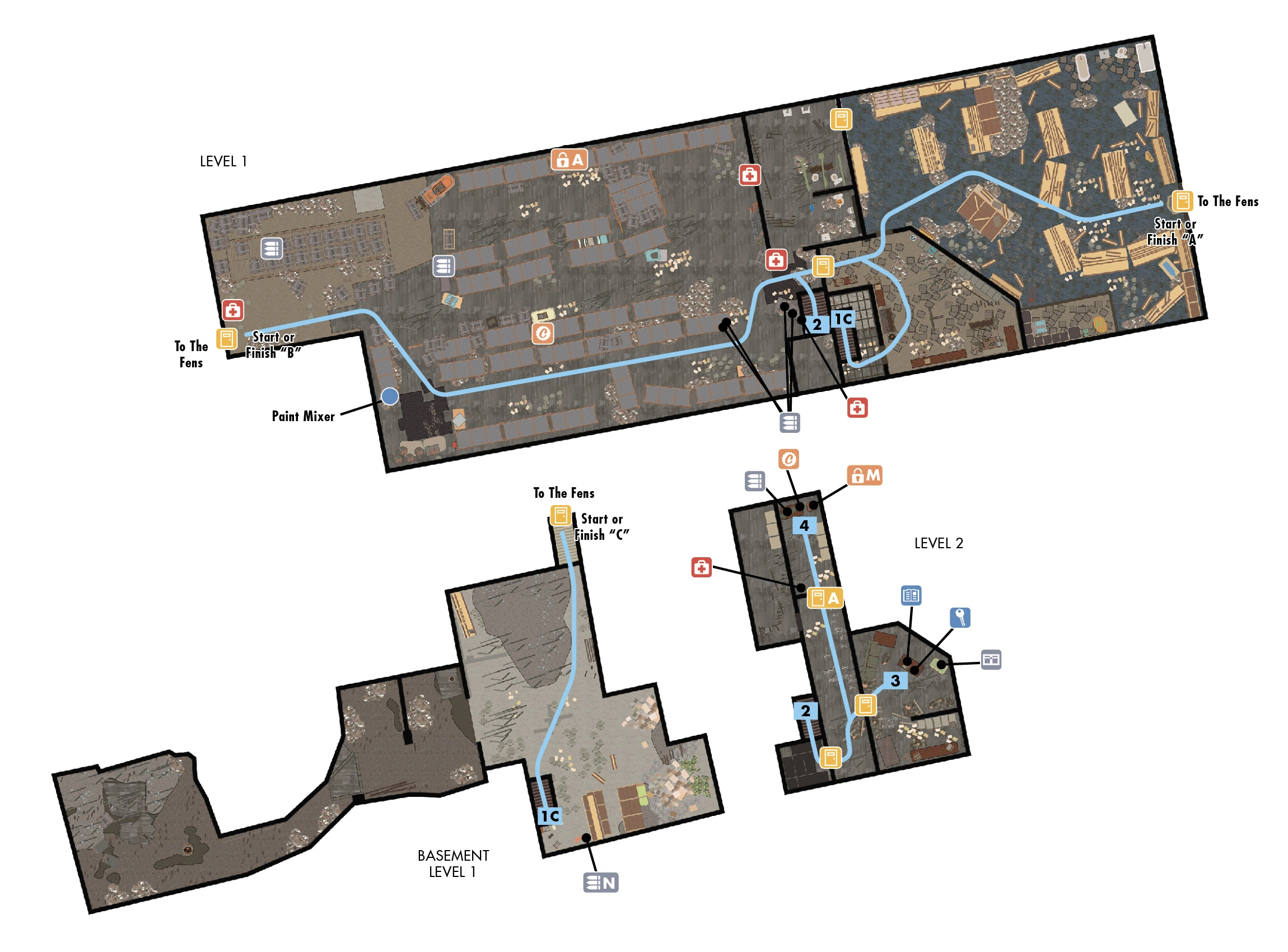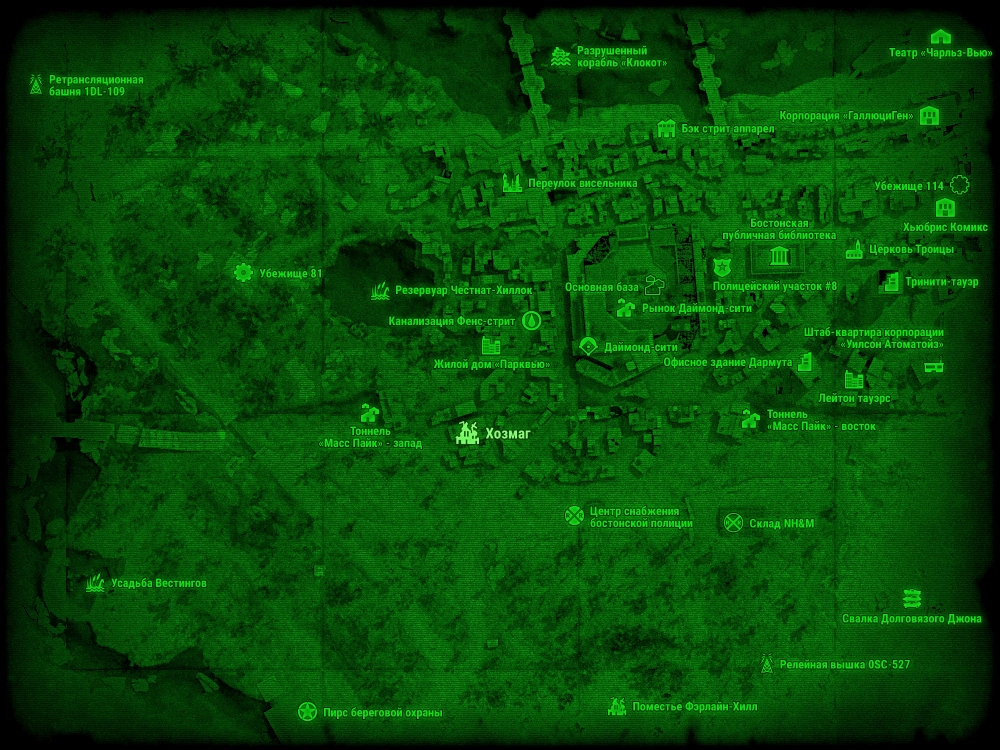 - Старый город в новом цвете • В конце склада стоит стеллаж с банками синей и жёлтой краски. Если перемешать их на машине рядом, получится зелёная краска, которая нужна маляру Эбботу в Даймонд-сити.