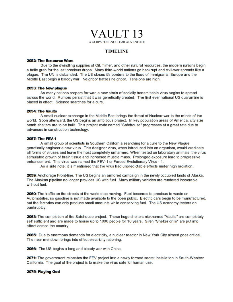 Документ описывает историю вселенной игры начиная с 2052 года и приводит основные события, повлиявшие на мир. Документ относится к раннему этапу разработки игры, еще носившей название Vault 13: A GURPS Post-Nuclear Adventure, и его сведения с развитием разработки по большей части устарели и теперь в большинстве своем не соответствует устоявшейся хронологии вселенной Fallout.