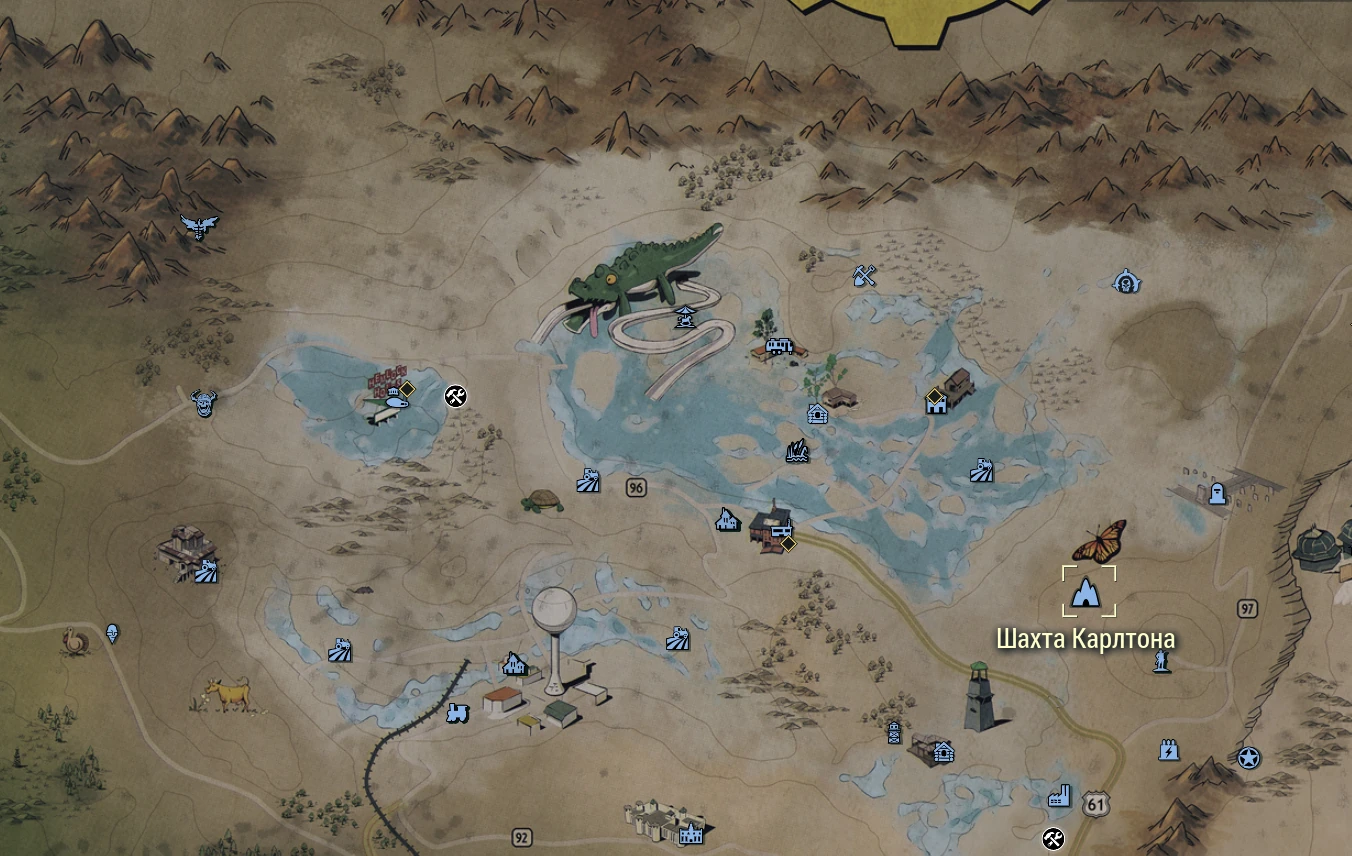 Шлаковая бездна Бекли · Брошенная шахта «Киттери» · Гастроли «Ядер-Мира» (fo76nwot) •Горящая шахта · Депо «Маунт Блэр» · Заброшенная шахта «Илейн» · Заброшенная шахта — стволы: 1 , 2 , 3 , 4 , 5 , 6 · Заправочная станция «Красная ракета» · Испытательный полигон АМС · Каменоломни Брима · Камера Кэмден-парка · Кладбище Плезент-Хиллс · Кэмден-парк · Льюисберг · Маунт Блэр · Место для засады у опоры · Недостроенный особняк · Разлом «Омега» · Озеро Рейнольдс · Отрыжка Бетти · Очиститель воздуха Хорнрайт — точки: 1 , 2 , 3 , 4 · Поместье Гарраханов · Рабочий лагерь «Роллинс» · Разлом · Релейная вышка HG-B7-09 · Ржавая кирка · Сияющие недра · Станция Льюисберг · Станция Уэлч · Страйкер Роу · Сэндвичи Сэла · Тоннель «Большой излом» — западная часть · Тупик Николсона · Убежище 63 · Уэлч · «Хорнрайт» — точки для испытаний: #02 , #03 , #04 · Брамуэлл · Ван Лоу, таксидермист · Забег по глине · Дом Эвана · Домик на дереве с трамплином · Ларек мусорщика из оранжевого брезента · Коттедж на берегу реки · Пыльная куча · Святилище в Пустошах · Складской подвал · Тоннель «Большой излом» · Туннель любви