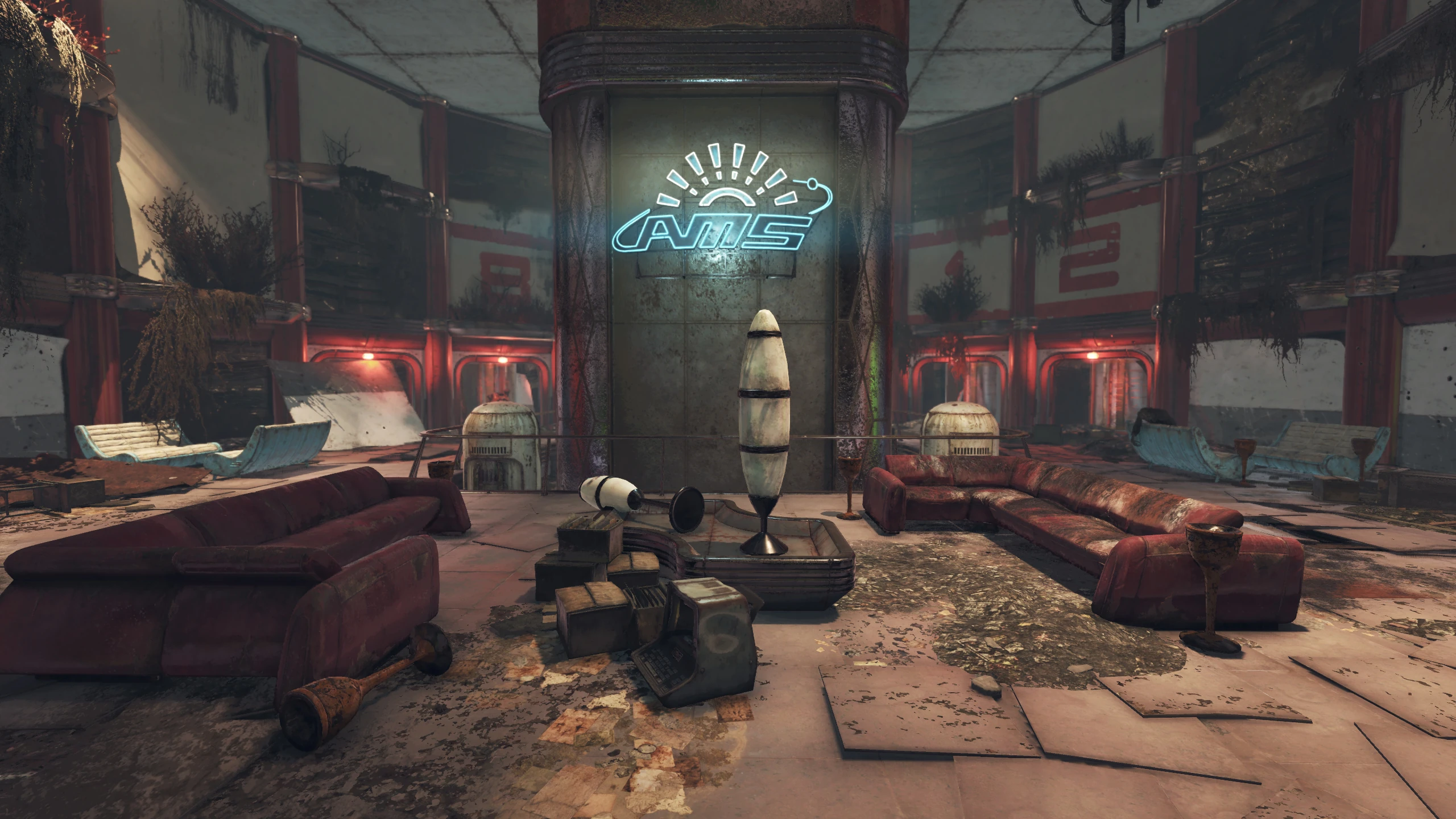 Прямо к востоку от верхней части лестницы находится набор панелей управления. На юге и севере расположены офисы, но в них нет ничего примечательного. На западной стороне этажа несколько скелетов в костюмах сидят вокруг большого деревянного стола для заседаний. В центре стола лежит куча довоенные деньги и три обломка ультрацита, а рядом на земле стоит запертый сейф (взлом замка 3).