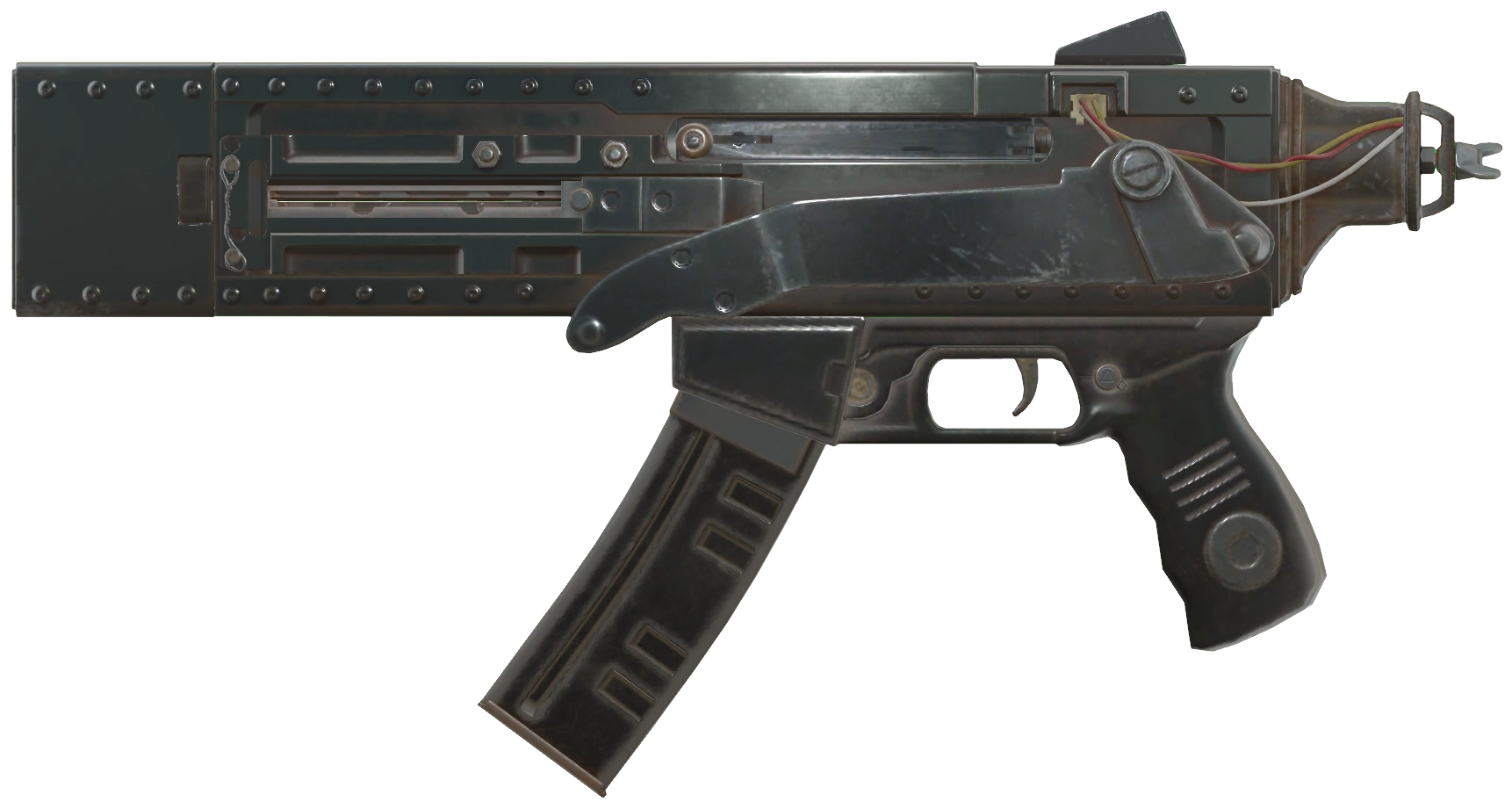 ПП с магазином на 30 патронов калибра 10 мм, с возможностью расширения до 45 патрон. Высокий темп стрельбы этого оружия компенсируются хорошей стабильностью и неплохой точностью. ПП хорошо показывает себя на близких дистанциях, но благодаря вполне хорошей дальности может быть полезен и на средней. Нет возможности установки прицела, но имеется вполне неплохой встроенный. Низкое потребление ОД — делает оружие вполне неплохим для использования в режиме V.A.T.S..
