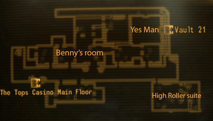 Номер Бенні знаходиться в центрі коридору. У нього можна потрапити через подвійні двері, єдині на цьому поверсі. Його люкс замкнений на рівень «Середній», хоча можна забрати ключ у самого Бенні або у одного з його охоронців. Його кімната також наповнена всіляким мотлохом, але найбільшу увагу гравця повинна залучити грубо виконана діра в стіні, яка з'єднана з секретної майстерні Бенні, де гравець може знайти Йес-мена і почати квест «Джокер».