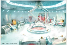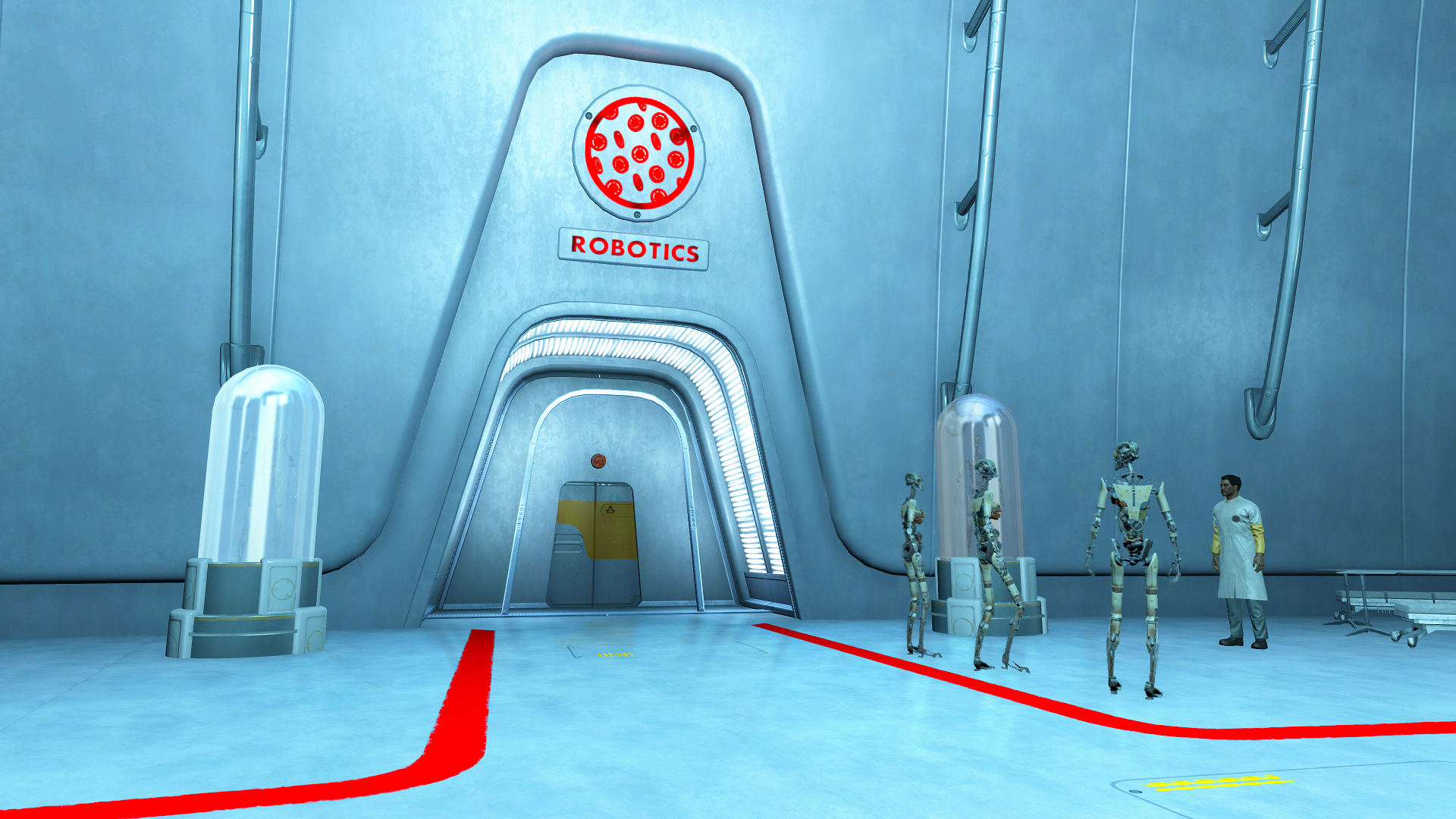Посеред великого круглого приміщення розташований резервуар з червоною рідиною, а зверху працюють три маніпулятора-складальника. По «кутках» знаходяться стенди з заготовками синто на різних стадіях. На першому збирають скелети, на другому нарощують плоть, на третьому накачують мускулатуру і в кінці виріб занурюють в резервуар, з якого виходить готовий синт.