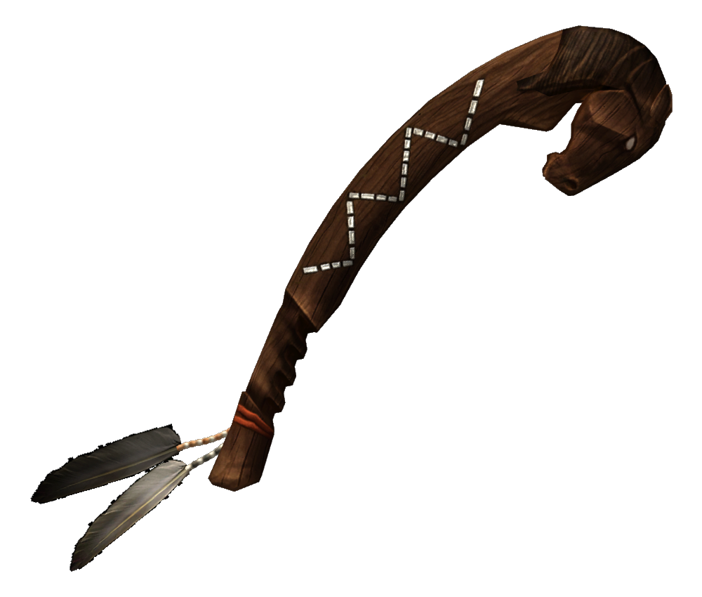 Являє собою вигнуту палицю з твердого дерева, прикрашену орнаментом і кількома пташиними перами у рукояті. Ударна частина кийки виконана у вигляді стилізованої голови коня.