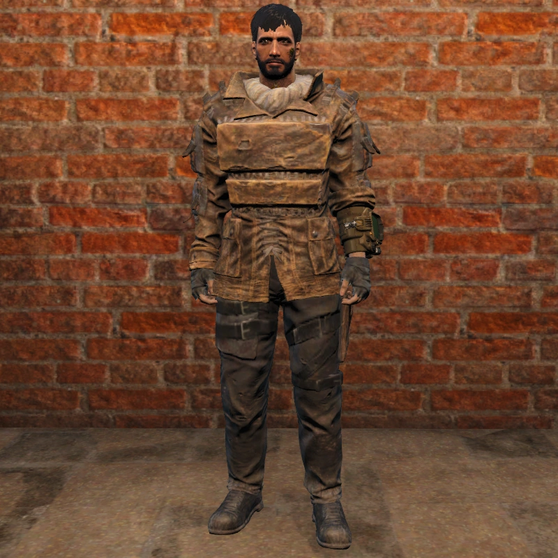 Коричневе шкіряне пальто, модернізоване умільцями «Підземки» для бойових дій шляхом нашивання бронепластин в ключових місцях.