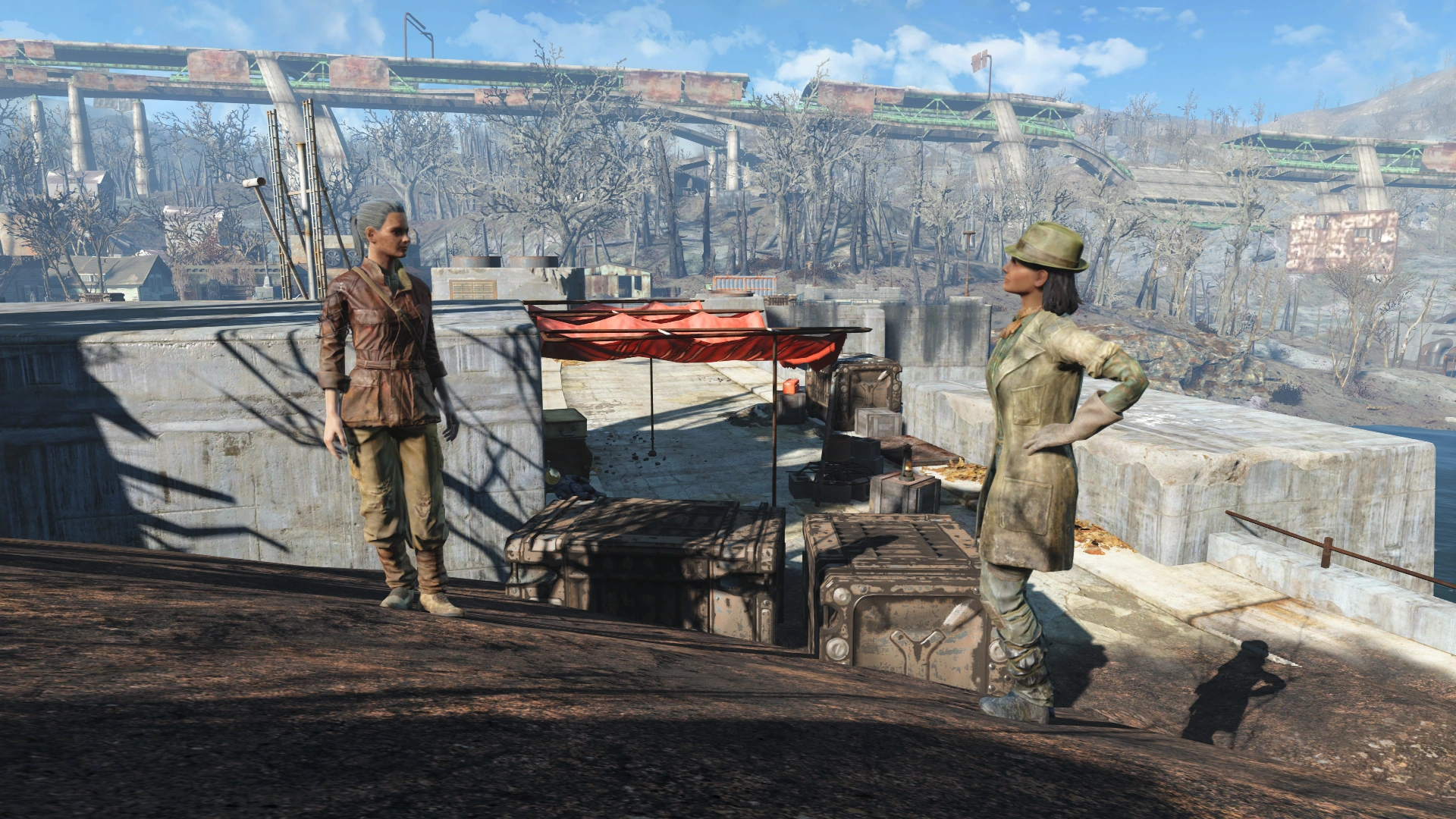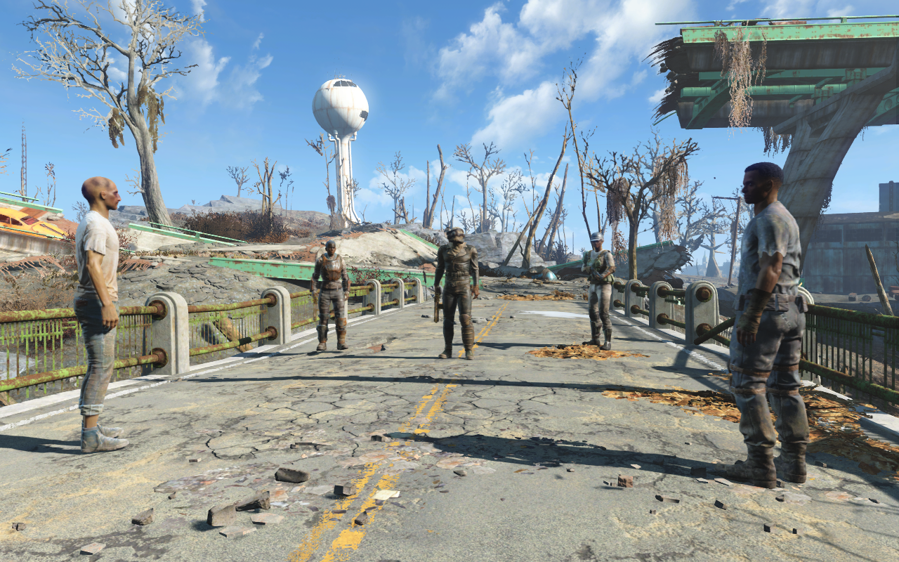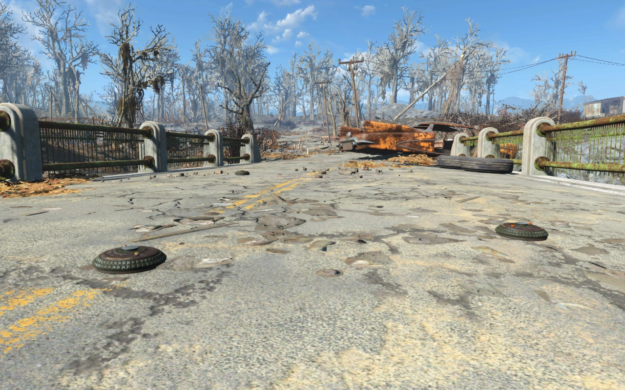 Міст патрулюють 3 рейдера (тип залежить від рівня персонажа) і вимагають хабар за прохід по мосту — 250 або 100 (якщо торгуватися) кришок. Також замість рейдерів можуть бути Стрілки (екіпірування залежить від рівня). Ці вимагають 1000 кришок. Можливі місця — мости ~ рибного заводу «Мэхкра», Согас Айронворкс і Аркджет сістемс.
