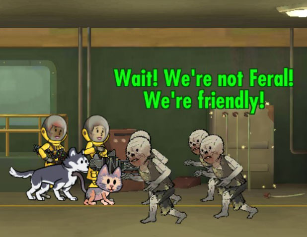 Внутрішнє облаштування сховища випадково. При переміщенні по локації жителям зустрінуться дикі гулі. Для виконання завдання жителям необхідно поговорити з гулями, що залишилися мирними.