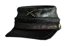 Чорна кашкет, зроблена з шкіри. На уборі є нашивка у вигляді двох гвинтівок.