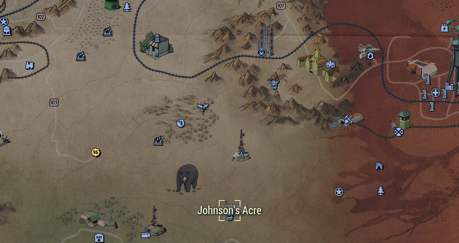 - ↑ 92. JOHNSON’S ACRE. This cabin was recently turned into a Raider execution camp; there is evidence of torture atop a nearby rock column with possible Power Armor at the top. Check the cabin and the picnic table, and delve into the outhouse for some items of interest.