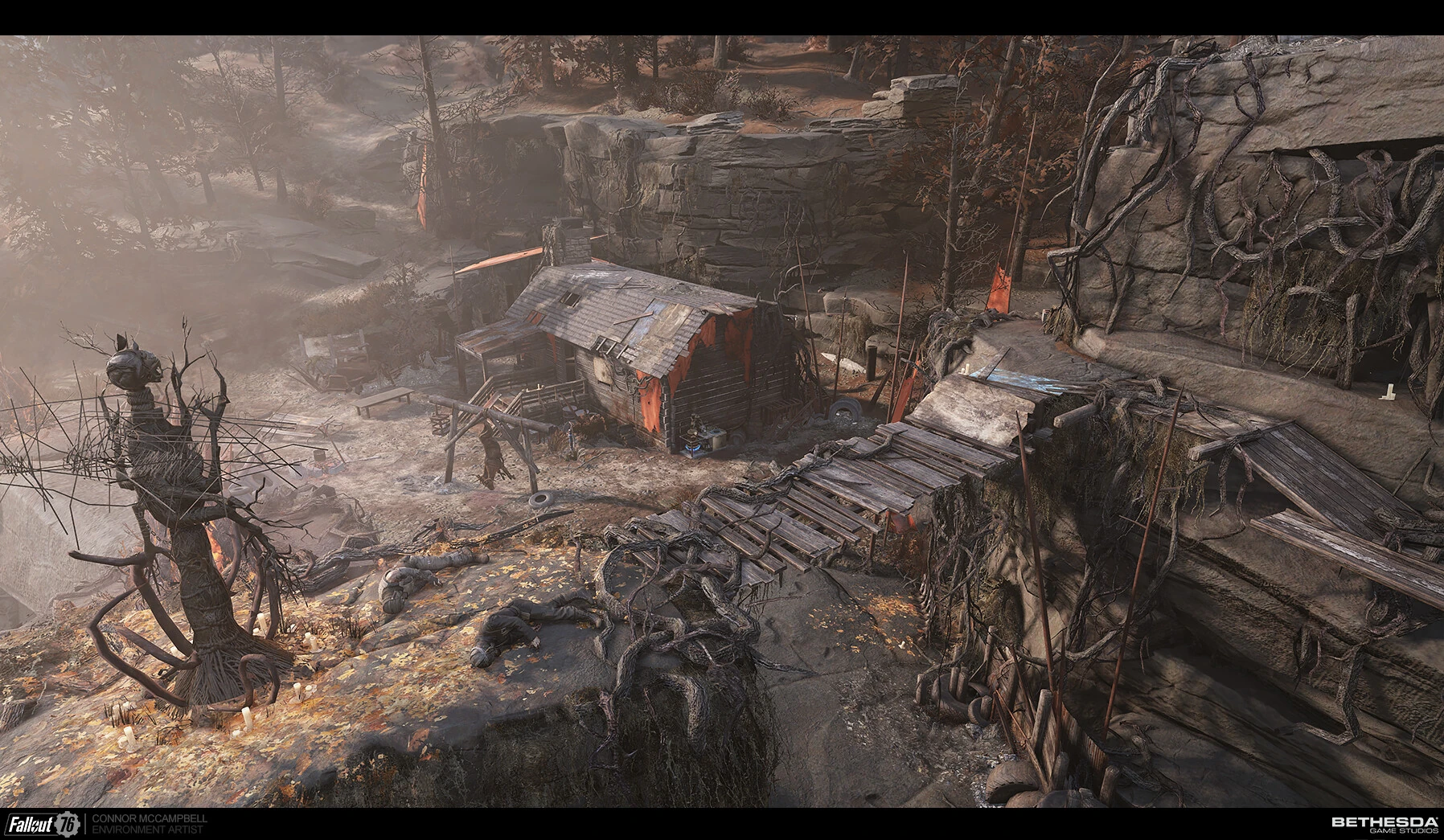 - На схід від хатини, на вершині високого скельного виступу з трьома мертвими скелетами (і, можливо, каркасом силової броні), біля кута зламаного дерев'яного ящика зі скелетом всередині.
