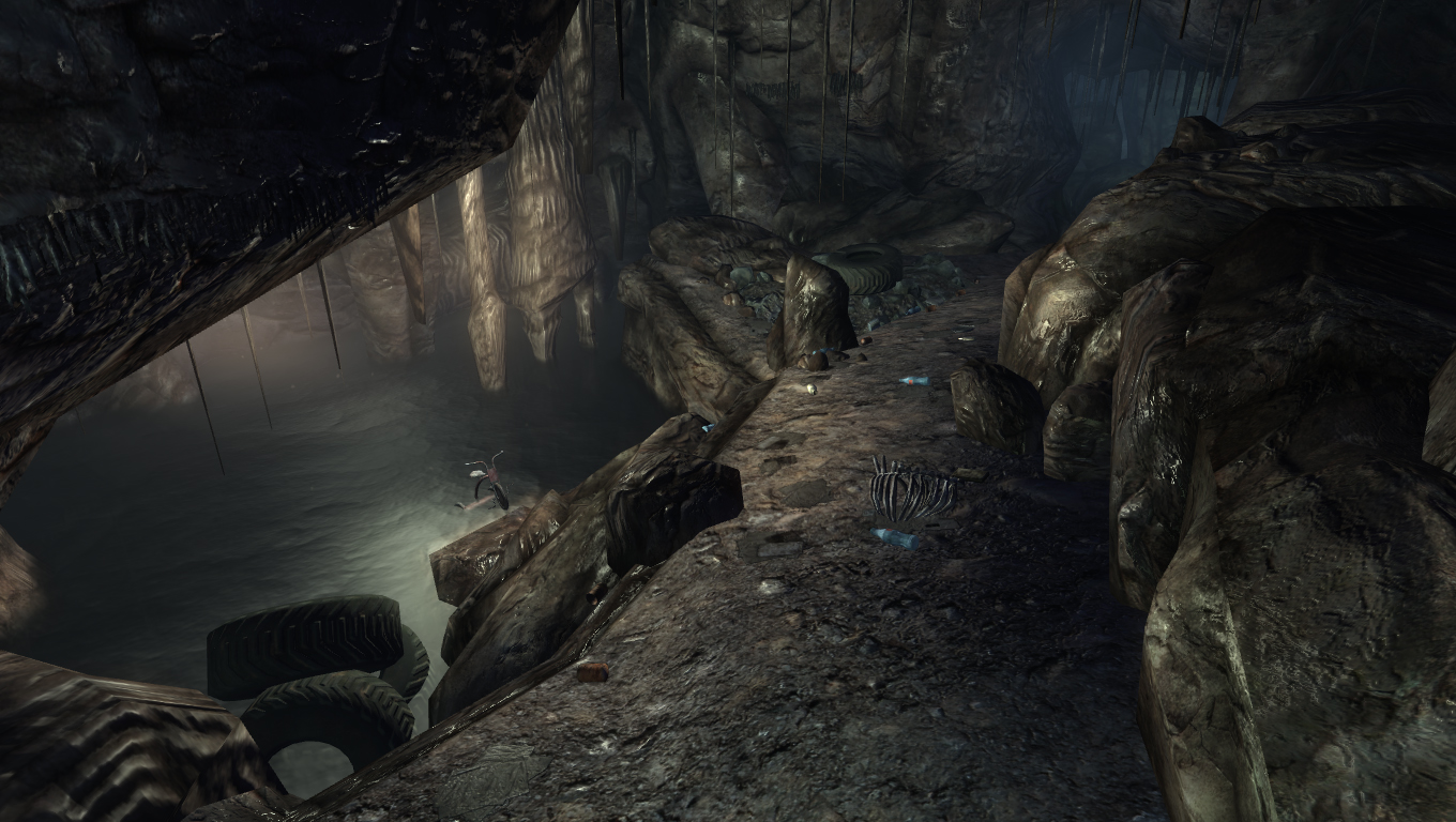 У нижній частині локації знаходиться невелике озеро з болотниками, на дні якого, крім цінних предметів і різного сміття покояться тіла рейдера і мешканця пусток. За озером печера розгалужується: у північному тунелі болотник охороняє боєприпаси і медикаменти, в південному знаходиться мета квесту — серце Харольда.