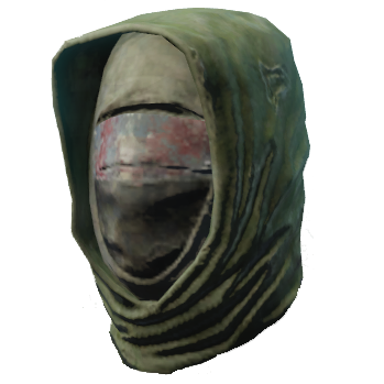 - Темно-зелений каптур з драпіруванням плечей, до якого кріпиться металева пластина з отворами для очей, що закриває верхню частину обличчя.