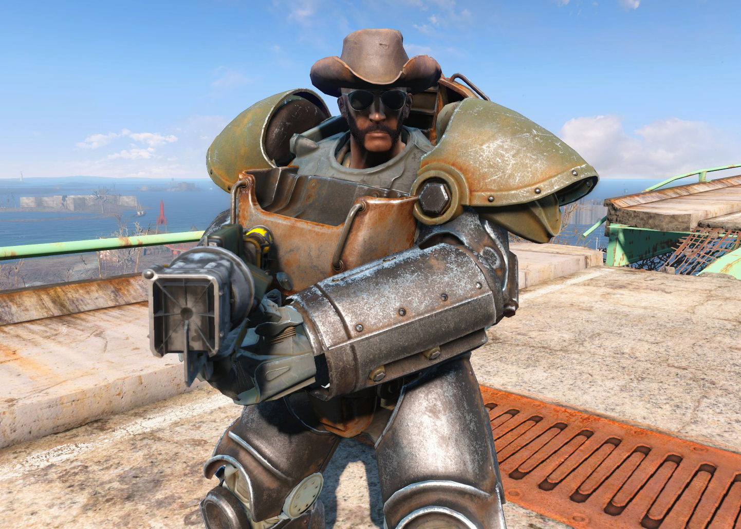 | Головний убір ополченця Спорядження минитмена Темні окуляри патрульного Силова броня T-51 (руки і ноги) Силова броня T-60 (торс) |