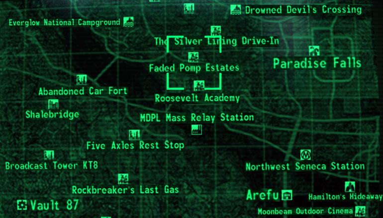 Це зруйноване довоєнне селище знаходиться на північ від Академії Рузвельта і південь від відкритого кінотеатру «Біла смуга». Всі будинки майже повністю зруйновані і від них залишилися лише руїни. Навіть збережених предметів тут можна знайти не так багато. Є кілька матраців, на яких можна поспати і в одному з будинків знаходиться невеликий сейф[1].