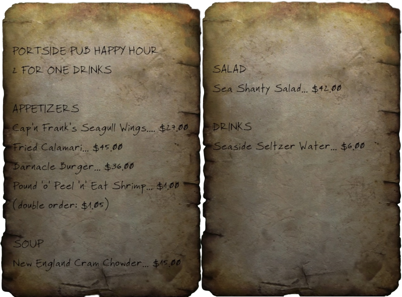Меню «Щасливої години» в пабі «Портсайд» (англ. Portside Pub happy hour menu) — замітка Fallout 76 .