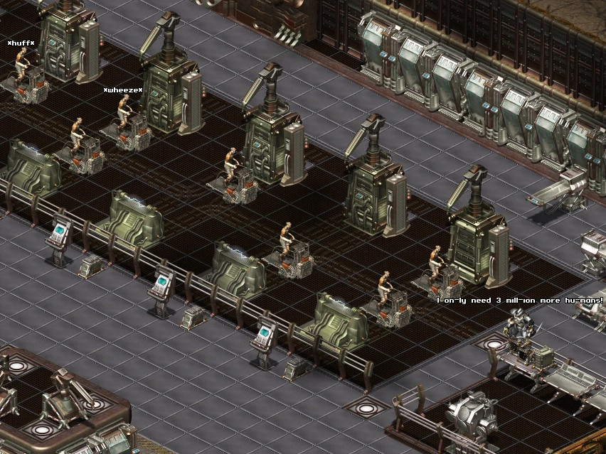 Усередині знаходяться кілька людей, прикутих до бігових доріжок, рух яких виробляє енергію («людинобатарейки»), і наглядає за ними робот-гуманоїд сріблястого кольору. Спочатку робот не агресивний.
