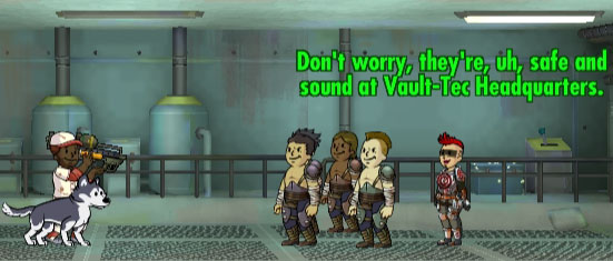 | « | Мені зустрівся гуль, який раніше був одним з «Головорізів Мексона». Він сказав, що інша команда опинилася в пастці в Сховищі 390. Починаємо рятувальну операцію! | » |