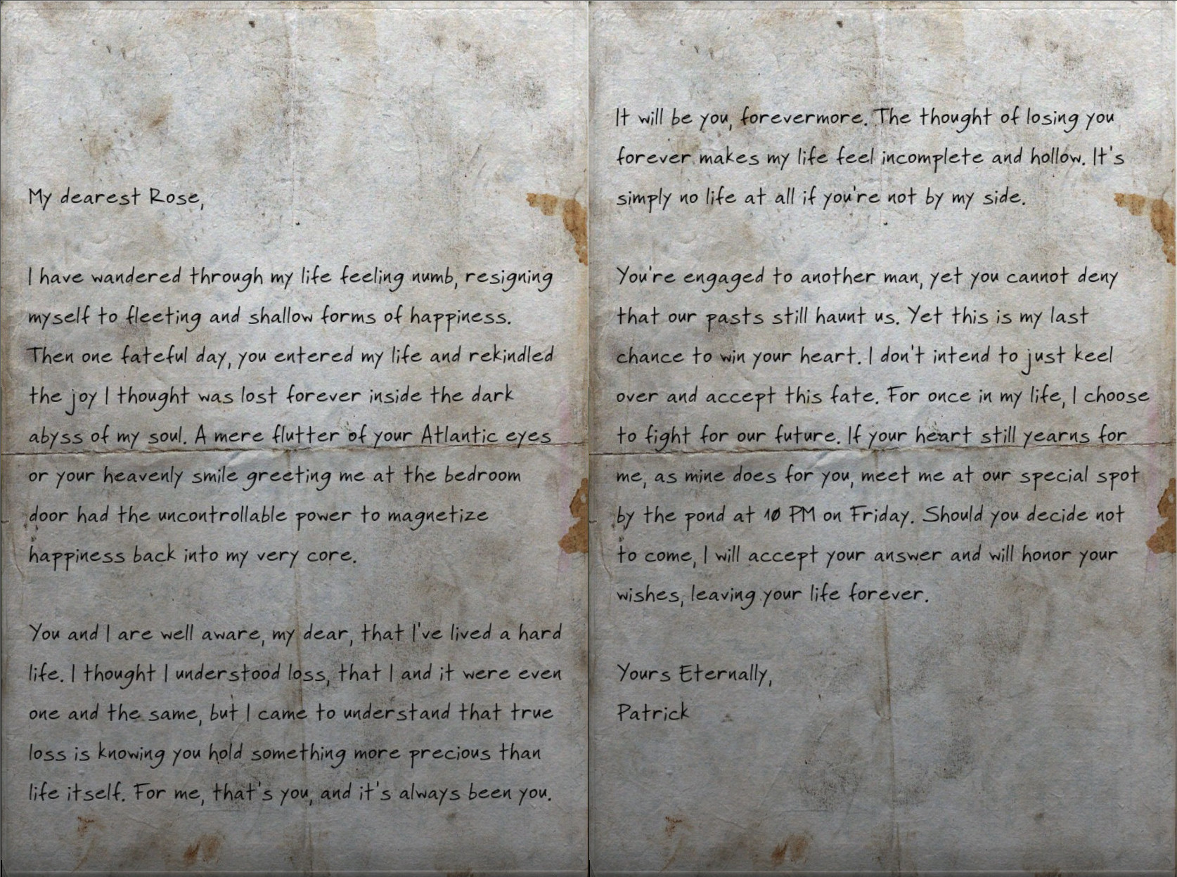 Я знаю, ти заручена з іншим, але ми обоє відчуваємо, як наше минуле досі не відпускає нас. Це мій останній шанс завоювати твоє серце, і я не готовий просто здатися чи прийняти цю долю. Вперше в житті я вирішив боротися за наше майбутнє. Якщо твоє серце все ще тягнеться до мене, як моє до тебе, приходь до нашого особливого місця біля ставка о 22:00 у п’ятницю. Якщо ти не прийдеш, я поважатиму твоє рішення і назавжди залишу твоє життя.