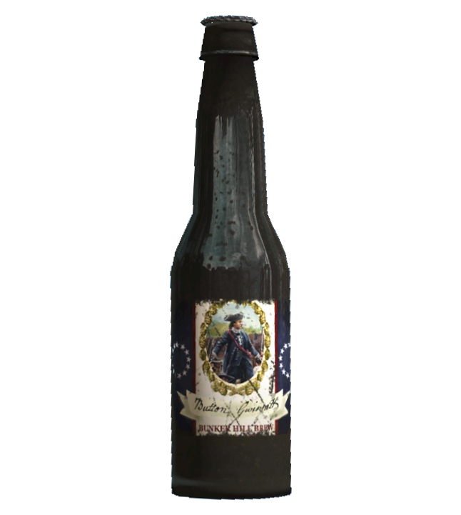 Пиво в пляшці з темного скла. На етикетці в медальйоні з вінка зображення солдата-колоніста в синьому мундирі (працівники пивоварні називали його - пиво «Банкер Хілл» . Знизу на світлій стрічці напис «Button Gwinnett», нижче напис — «Bunker Hill Brew». По краях емблема колоністів - коло з білих зірок на синьому полі.