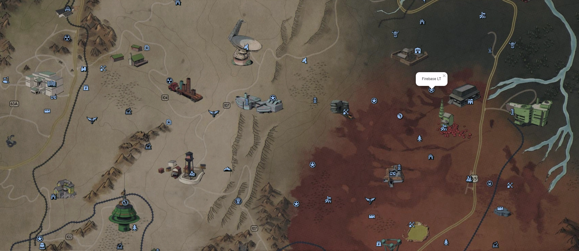 - ↑ 04. FIREBASE LT. If you’re planning on C.A.M.P.ing close by and need the extra firepower, repair one of the two automated surface-to-air missile turrets at this small tent base. Otherwise, come here for the scavenging (and Power Armor) potential.