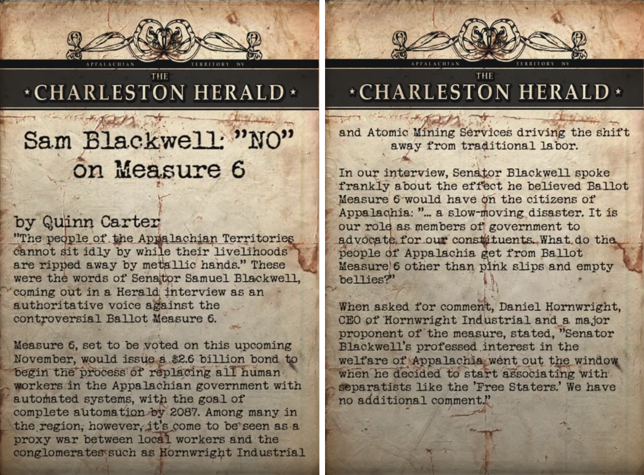 Сем Блеквелл: «Ні» щодо законопроекту № 6 (англ. Sam Blackwell: "No" on Measure 6) — нотатка у Fallout 76.