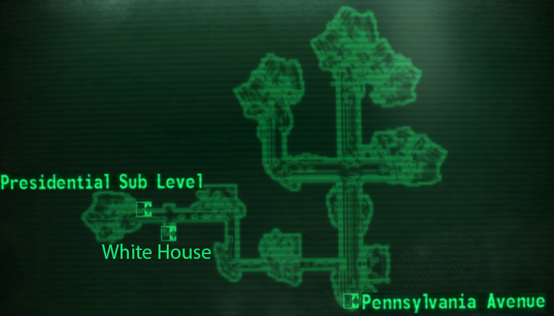 Невеликий колектор з кількома тупиковими (заваленими уламками) гілками, що з'єднує район Пенсільванія з майже повністю зруйнованим Білим Домом. Всередині можна виявити службову кімнату з верстаком і різними компонентами саморобної зброї. Крім всіляких контейнерів, Подорожній може досліджувати холодильник і аптечку (ще одна аптечка знаходиться в самому кінці північно-західного кута). Одна з «пам'яток» тунелю — верхня частина скелета загиблого мотоцикліста, що звисає зі стелі. Ймовірно, бідолаха намагався зробити стрибок на мотоцикле через автомобіль, але зачепився головою за світильник. Решта кістки розкидані по дощатому схилу між машиною і мотоциклом.