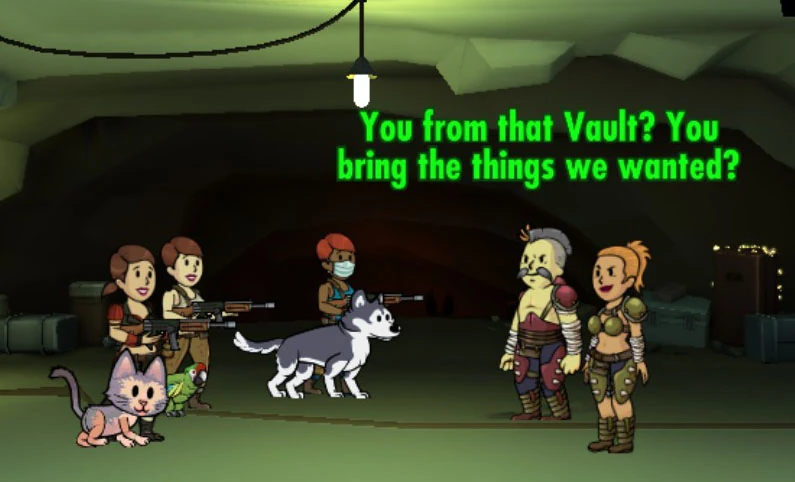 | Ви з того Сховища? Принесли те, що нам потрібно? | Ну, кришки та їжу ми вирішили не брати... Зате взяли гармати! | Ми зовсім не те мали на увазі! |