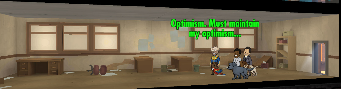 | « | Наближається річниця нашого першого входу до Сховища, і це гарна можливість покращити моральний дух Сховища, влаштувавши святкування! У нас є їжа, у нас є музика, але, здається, коли «Волт-Тек» складав наші початкові запаси, вони забули включити прикраси для вечірки! Нам доведеться відправити команду до найближчого супермаркету , щоб знайти... | » |