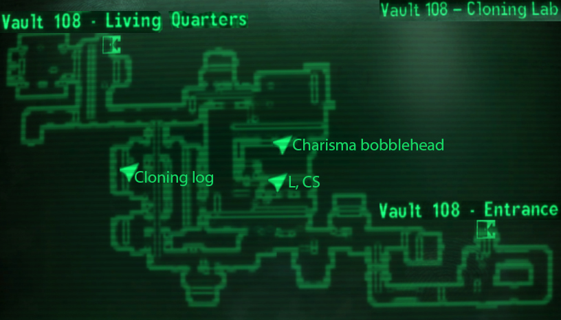 - Стелс-бій — на столі між терміналами, який знаходиться за першими дверима всередині сховища, праворуч від входу в Житлові кімнати.
