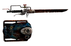 Ручне гальмо від мотоцикла є і рукояттю цієї зброї, і перемикачем для активації запальника. Бензобак від мотоцикла надівається за спину у вигляді ранця для зберігання запасу палива, запальник служить для запалення горючої газоподібної суміші. Одночасно на праву руку персонажа одягається захисна рукавичка (кухонні прихватки), формально в комплект зброї не входить. Лезо газонокосарки використовується для нанесення ударів під час бою обійнято полум'ям палаючого палива..