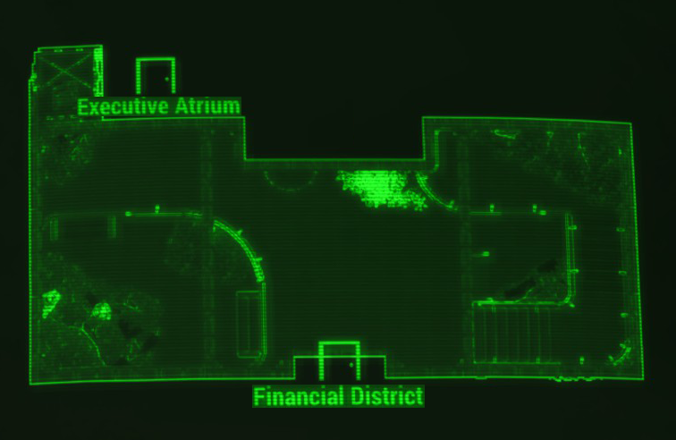 The entrance is guarded by two ceiling turrets. Raiders or Gunners will spawn on one side of the building and robots on the other. When the Sole Survivor approaches, they will usually begin to fight each other.