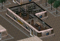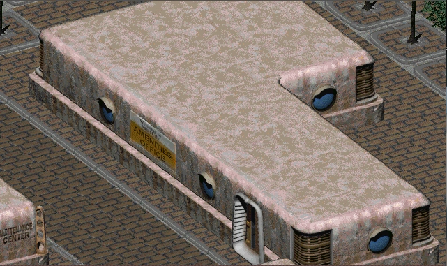 Just east of the maintenance center, the amenities office is a small, two room building. Randal, the Chief Amenities Officer, can be found in the first room. A servant (slave) is working in the back room. None of the shelves in the storage room can be looted. The desk in the front room is locked, and attempting to loot either bookcase will make Randal reply to keep hands away. Continued attempts to loot either bookcase will turn Vault City hostile.